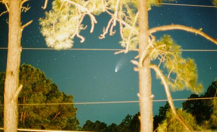 Saw the comet naked eye right next to the large concrete power pole to the northwest of my porch, it was bright and instantly obvious as a comet despite the high light pollution, including all of the tennis court lights across the street. In the binocs it appeared to have about three degrees of tail. The tail was much brighter than previous comets and was pointing almost due north. Jay was visiting and thought this comet was much more impressive that Hyakutake.